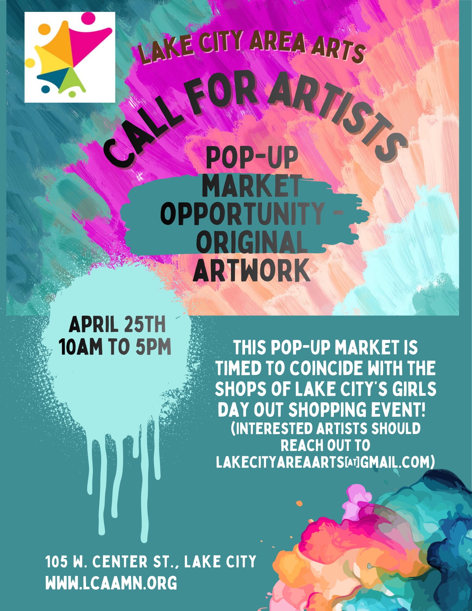 Popup Market exhibitors wanted for April 25th: Lake City Area Arts will be holding a one day Artisan Pop-up Market on Saturday, April 25th from 10 a.m. to 5 p.m. This pop-up market is scheduled as part of an annual girls day out event organized by Shops of Lake City which draws quite a bit of shopping traffic to town. For more detail, see the CONTRACT and MN FORM ST-19 requirement.